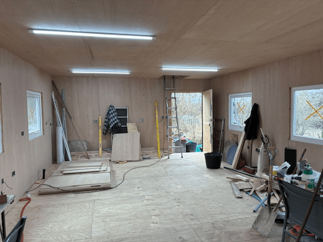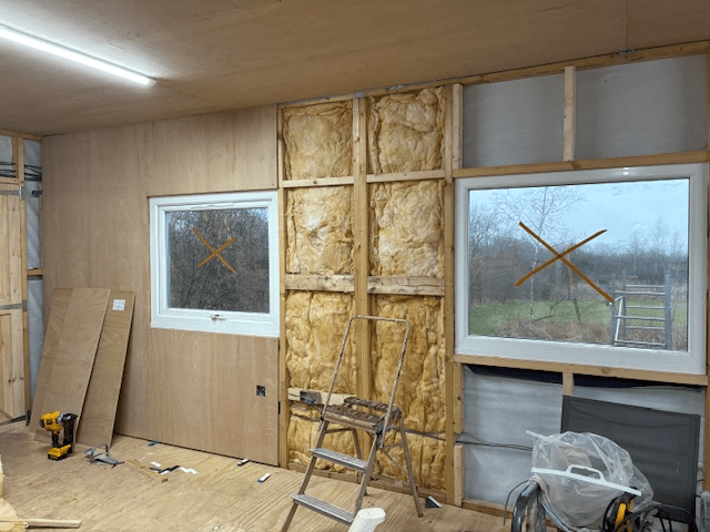 The ceiling has been boarded out with plywood. Insulation is in the loft ready to be laid out when the wiring for the lights is completed and the internal walls have been insulated and boarded out with sheets of plywood.