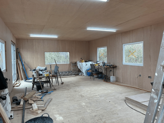 Next steps include installing patio doors, guttering, drains, flooring and first fix electricity and water supply.